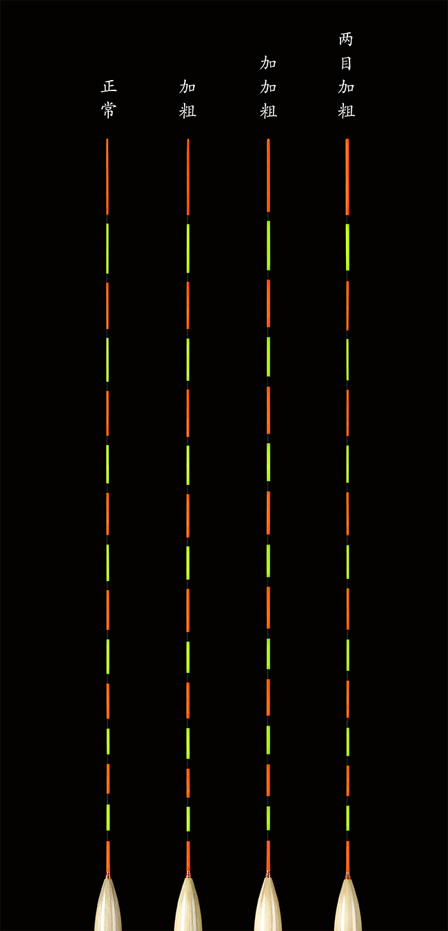 3.漂尾兩目加粗:將漂尾尾尖加粗兩目,讓尾尖兩目更粗、更醒目(少數(shù)漂型也可以做三目)?,F(xiàn)有的加粗尺寸為0.8mm-1.4mm幾種規(guī)格,但加粗的具體尺寸在制做時,需要根據(jù)漂尾先徑來選擇。