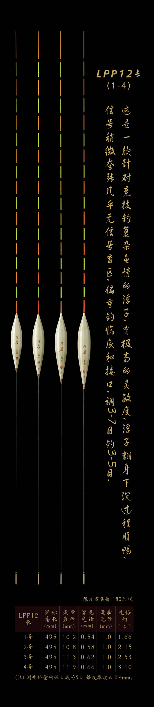 LPP12長:這是一款針對競技釣復雜魚情的浮子,有極高的靈敏度,浮子翻身下沉過程順暢,信號稍微夸張幾乎無信號盲區(qū),偏重釣臨底和接口,調3—7目,釣3—5目。