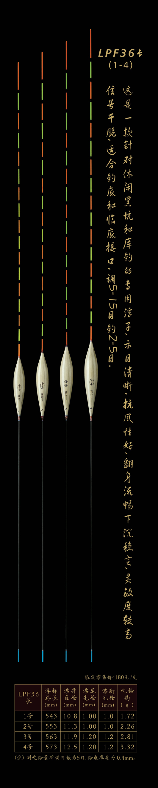 LPF36長:這是一款針對休閑黑坑和庫釣的專用浮子,示目清晰,抗風性好,翻身流暢下沉穩(wěn)定,靈敏度較高信號干脆,適合釣底和臨底接口,調5—15目,釣2—5目.